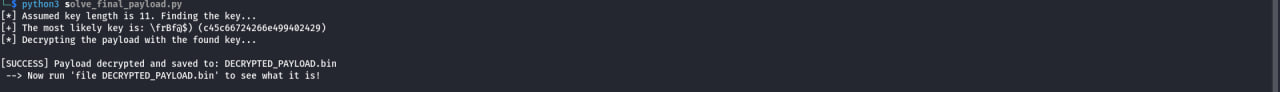 در نهایت برای آخرین گام ، پس از کشف طول کلید، با اسکریپت نهایی (solve_final_payload.py)، خود کلید ۱۱ بایتی را بازیابی و فایل out.bin را رمزگشایی کردیم. خروجی با موفقیت کلید را پیدا کرد و در نهایت در فایلی به اسم DECRYPTED_PAYLOAD.bin ذخیره کرد.