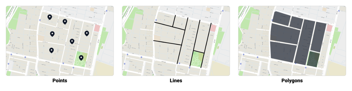 دادههای مکانی(فضایی) در قالب فرمتهای مختلف وجود داره. سه نوع داده مکانی داریم: نقاط، خطوط و چندضلعیها. با اتصال نقاط به هم، خط و با اتصال خطوط به هم سطحی بسته و چندضلعی درست میشه.