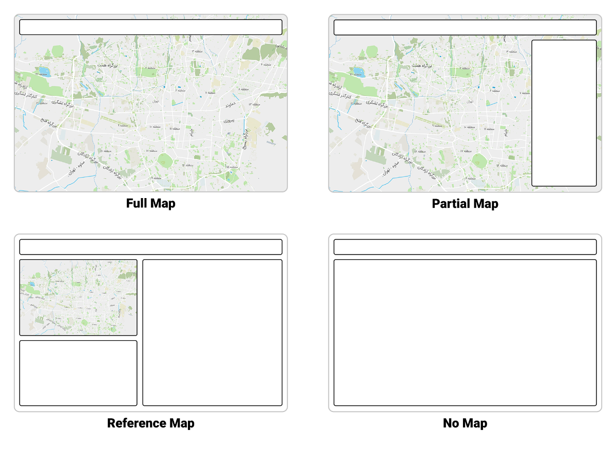 تو طراحی نرمافزاری که نقشه یکی از بخشهای مهمش محسوب میشه، همیشه باید با توجه به اولویت استفادهی کاربر از نقشه، جایگذاریش رو مشخص کنیم. توی طراحی وب، معمولاً ۴ مدل نمایش نقشه داریم: