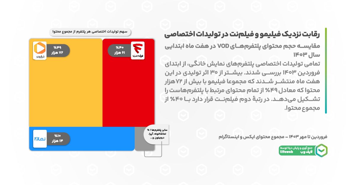 بیش از ۳۰ اثر در سال ۱۴۰۳، تولیدات اختصاصی پلتفرمها بودند. تقریبا نیمی از آنها سریال و نیمی دیگر رئالیتیشود بودند. از مجموع محتوای مرتبط با این آثار، در ایکس و اینستاگرام، نزدیک به ۴۹% از تولیدات مربوط به فیلیمو است. بررسیهای لایفوب نشان میدهد که سهم فیلیمو از محتوای مرتبط با سریالها تقریبا نیمی از تمام آنهاست.