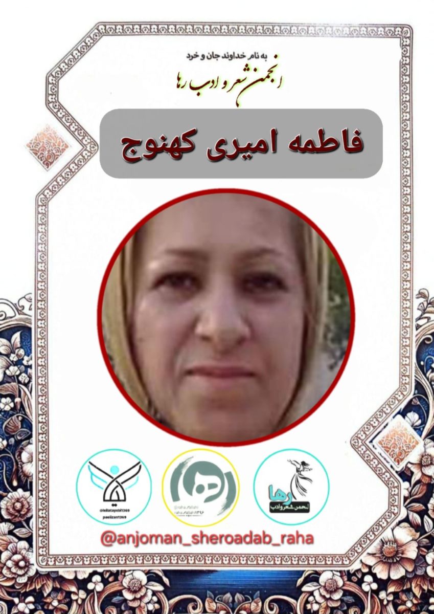 زندهیاد "فاطمه امیری کهنوج"، متخلص به "فرح"، داستاننویس و عضو فعال بنیاد جهانی سبزمنش، زادهی سوم آذر ماه ۱۳۴۲ خورشیدی، در بندر ماهشهر خوزستان، بود که در نهم شهریور ماه ۱۴۰۳ خورشیدی، در شیراز درگذشت.