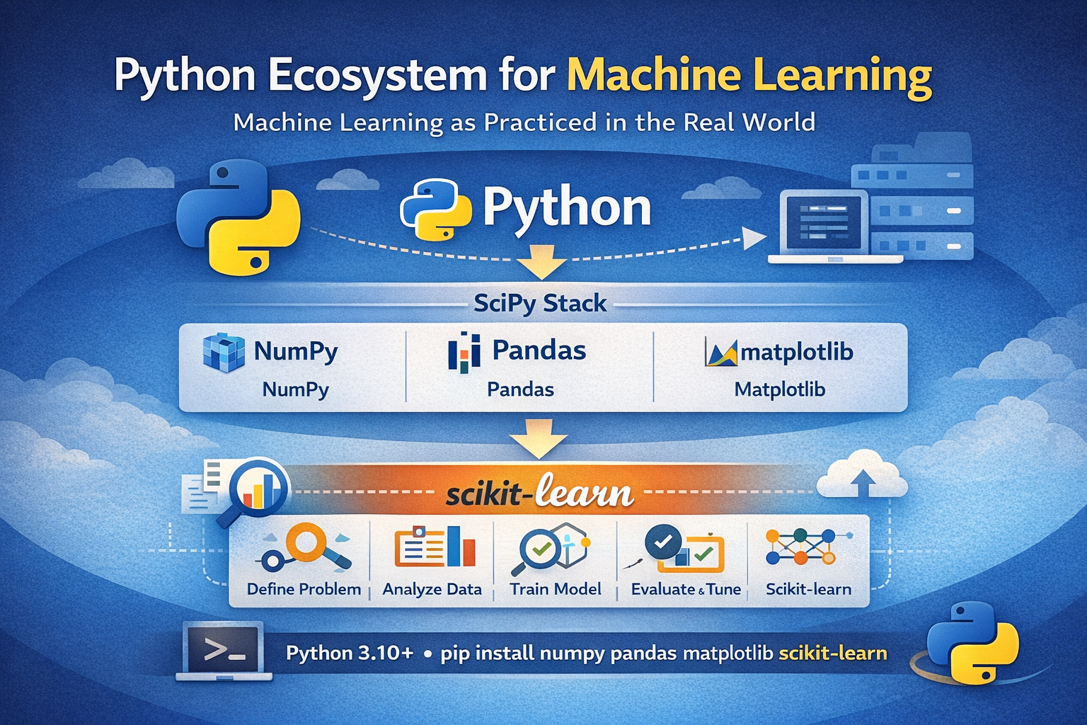 Python Ecosystem for Machine Learning ------------------------------------- +-------------------------------------------------------------------+ | Python (Language) | | general-purpose | scripting | notebooks | production services | +-------------------------------+-----------------------------------+ | v +-------------------------------------------------------------------+ | SciPy Stack (Core Ecosystem) | | | | +-----------+ +-----------+ +-------------+ | | | NumPy | | Pandas | | Matplotlib | | | | arrays | | tabular | | plotting | | | | vectorize | | ETL/EDA | | charts | | | +-----------+ +-----------+ +-------------+ | | \ | / | | \ | / | | v v v | | +-------------------------------+ | | | Data in a common form | | | | arrays + dataframes + plots | | | +-------------------------------+ | +-------------------------------------------------------------------+ | v +-------------------------------------------------------------------+ | scikit-learn (ML Toolkit) | | | | +----------------+ +---------------------+ +--------------+ | | | Preprocessing | | Model Training | | Evaluation | | | | scaling/enc |-->| fit/predict |-->| metrics/CV | | | | impute/split | | classification | | test harness | | | +----------------+ | regression | +--------------+ | | | | clustering | | | | v +---------------------+ v | | +----------------+ | +------------------+ | | | Pipelines |<-----------+----------->| Tuning/Ensembles | | | | repeatable | | grid/random/Bayes| | | | reproducible | | RF/GB/Stacking | | | +----------------+ +------------------+ | +-------------------------------------------------------------------+ | v +-------------------------------------------------------------------+ | Your Workflow (End-to-End) | | | | 1) Define Problem (Problem Definition) | | 2) Analyze Data (Data Analysis / EDA) | | 3) Prepare Data (Data Preparation) | | 4) Evaluate Models (Algorithm Evaluation) | | 5) Improve Results (Model Improvement) | | 6) Deliver/Use Model (Deployment / Inference) | | | +-------------------------------------------------------------------+ | v +-------------------------------------------------------------------+ | Environment Setup (Modern) | | | | Python 3.10+ | venv/conda | pip install ... | versions | | | +-------------------------------------------------------------------+