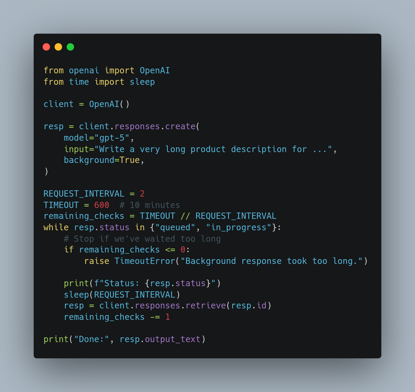 موضوع این بود که یک رکوئست سنگین به مدل GPT-5 میزدم و گرفتن پاسخ حدود 4 تا 5 دقیقه طول میکشید و همین باعث میشد خیلی اوقات با خطای Time-out شبکه مواجه بشم.