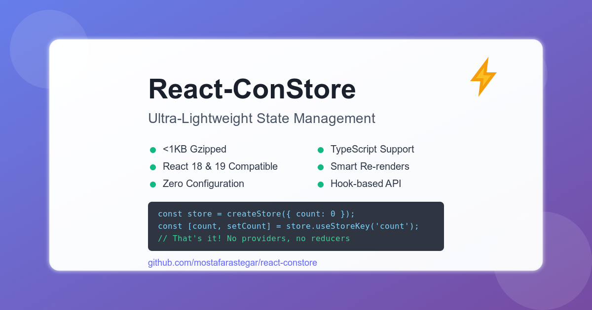 Library Size Complexity React 19 Ready React-ConStore ~950B ✨ Minimal ✨ ✅ Redux Toolkit ~2.5KB High ✅ Zustand ~2.1KB Medium ✅ Jotai ~2.8KB Medium ✅