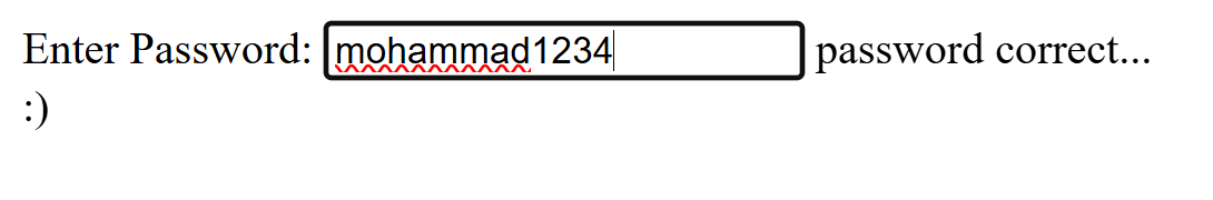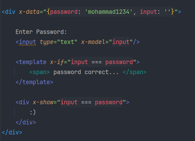 الان باید بتونید قسمت های مختلف این کد رو متوجه بشید. با x-data دوتا متغیر مختلف تعریف شده، یکی چیزیه که کاربر از طریق input وارد میکنه و اون یکی هم پسورد واقعی هستش. هر وقت کاربر mohammad1234 رو وارد بکنه، اول شرط if درست میشه و متن درست بودن پسورد نشون داده میشه و بعد از اون شرط x-show برقرار میشه و اون بخش از کد هم نشون داده میشه.