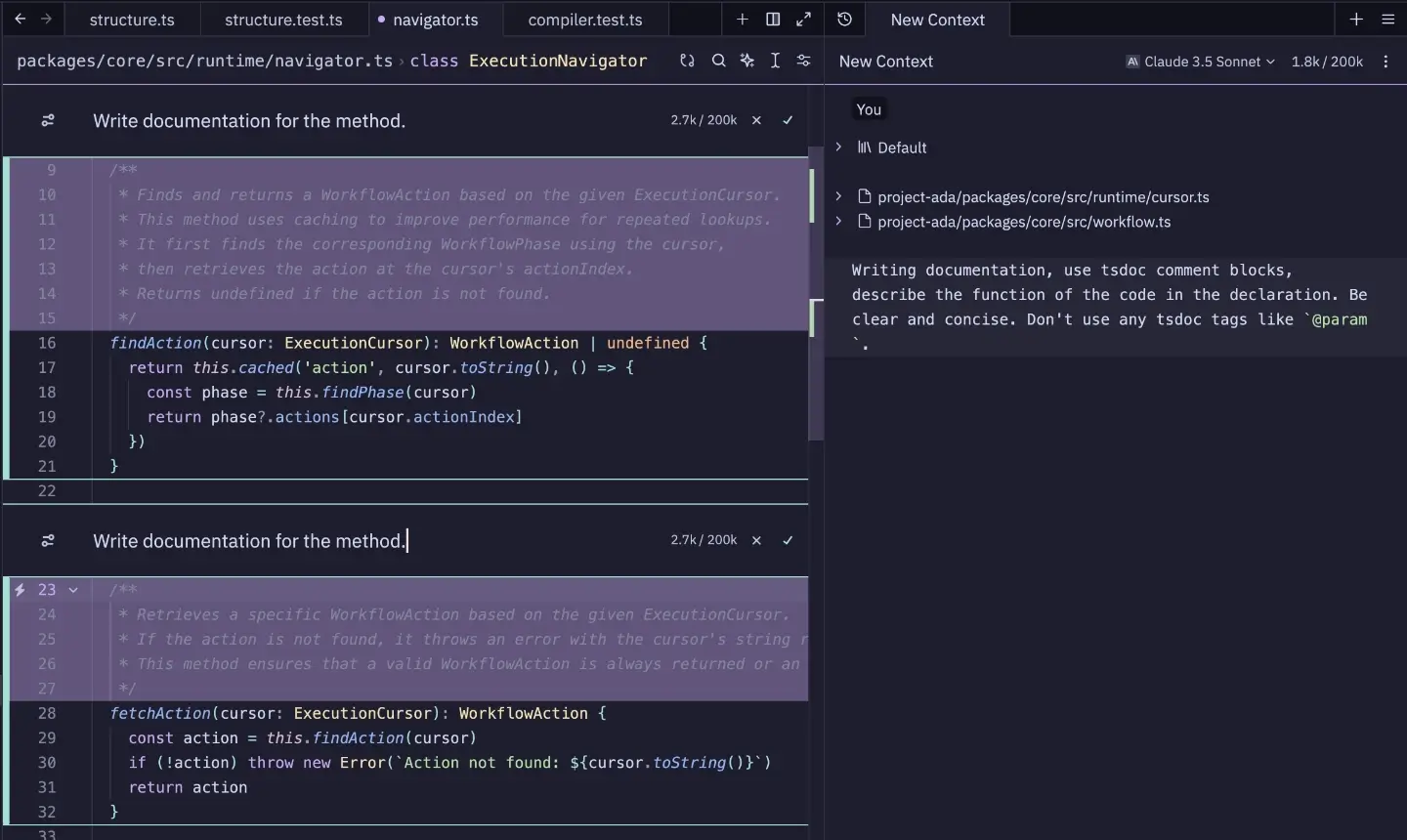 وقتی دستیار درونخطی را با میانبر cmd/ctrl+Enter فعال میکنید، اگر پنل دستیار نیز باز باشد، آن پنل بهعنوان زمینهی اضافی در کنار دستور درونخطی شما در نظر گرفته میشود. این موضوع در ابتدا شاید خیلی واضح نباشد، اما وقتی متوجه شوید که سیستم به این شکل کار میکند، ترکیب یک دستور دقیق در پنل دستیار با یک فرمان ساده درونخطی، به ابزاری قدرتمند تبدیل میشود.