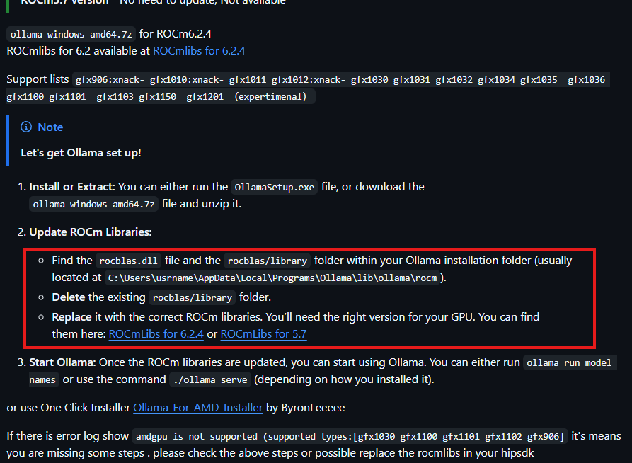 ابتدا وارد این لینک شوید و سپس به بخش دوم راهنمای نصب یعنی Update ROCm Libraries رفته و در آنجا یک یا دونسخه از پچهای مربوط به راهاندازی GPU وجود دارد که با نامهایی مانند ROCmlibs for 6.2.4 و مشابه آن مشخص شدهاند.