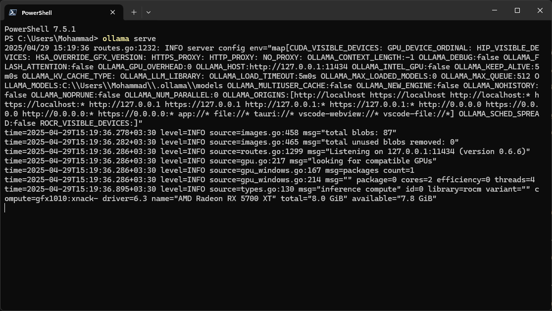 اگر حین وارد کردن این دستور خطایی نمایش داده شده، مطمئن شوید که Ollama از بخش System Tray بسته شده است و مجدد دستور را وارد و امتحان کنید.