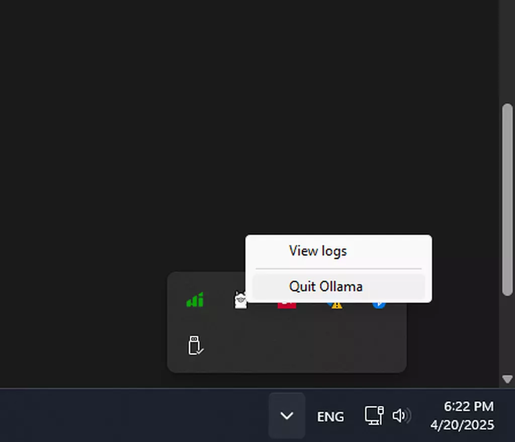 در گام نخست بهتر است که Ollama را از بخش System Tray ببندید تا حین بهروز رسانی با مشکل یا خطای نوشتن فایلهای جدید روبرو نشوید.