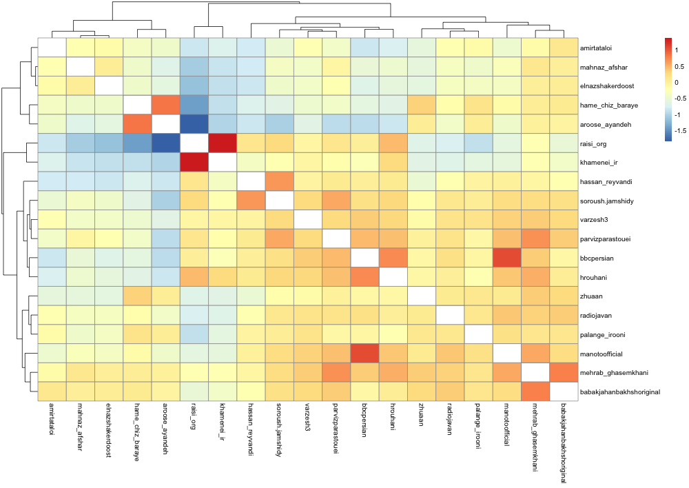 کار جذابتری که بعدش اانجام دادم این بود که حدود ۲۰ تا از صفحات معروف ایرانی رو کراول کردم و دیتاشون رو در اوردم. بعد سعی کردم ببینم این پیجها چقدر به هم نزدیک هستند. برای این که یه متریک خوب از این که دو پیج چقدر به هم نزدیک هستند در بیارم، از فرمول Pointwise Mutual Information استفاده کردم که یه مقدار تاثیر میزان فالوئرهای یه صفحه رو کم میکرد و بعدش به کمک کتابخونه pheatmap تو R یه همچین تصویری کشیدم: