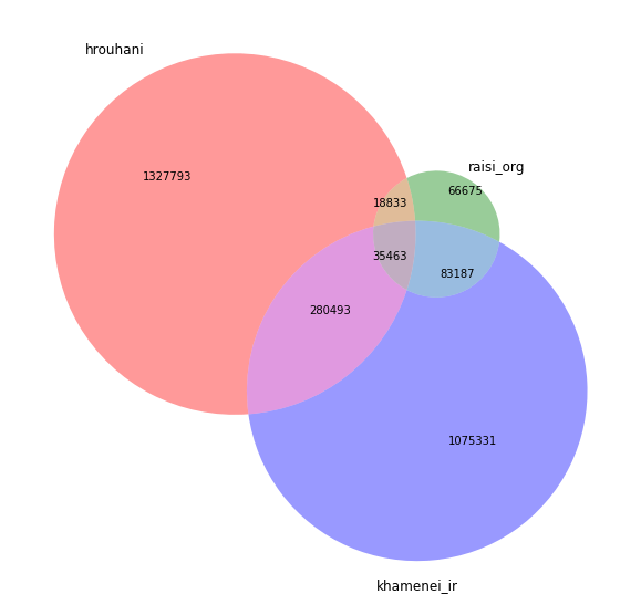 چیز اصلی که میخواستم در بیارم اشتراک لیست فالوئرهای پیجهای مختلف بود. و این که کلاً چقدر به هم ربط دارند این صفحات. برای بعضی صفحات خاص نمودار ون کشیدم که اینجا میبینید: