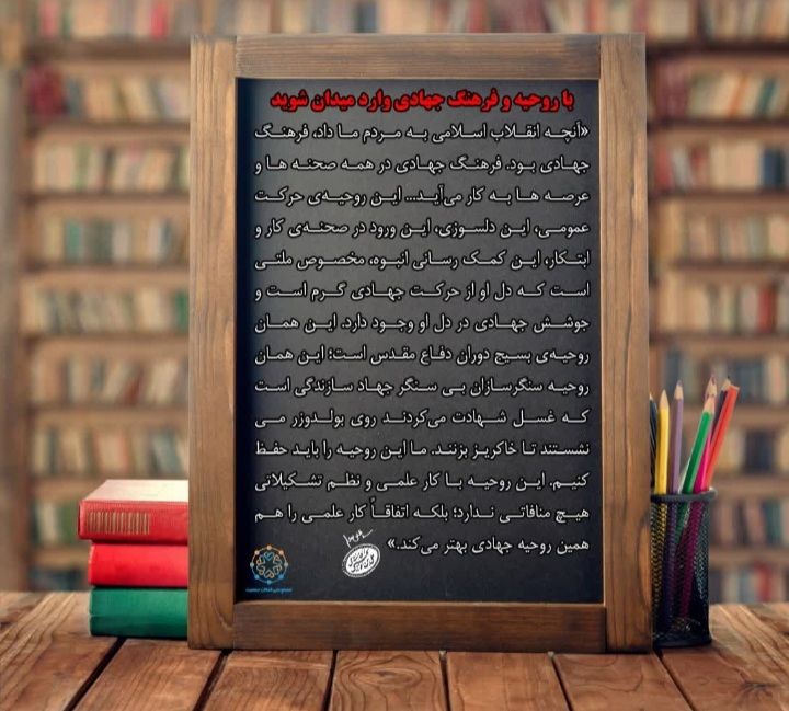 🔹امام خامنهای: «آنچه انقلاب اسلامی به مردم ما داد، فرهنگ جهادی بود. فرهنگ جهادی در همه صحنهها و عرصهها به کار میآید. در زمینه کارهای زیربنایی کشاورزی و دامداری و امثال اینها هم از اوّل انقلاب، روح و فرهنگ جهادی وارد میدان شد.