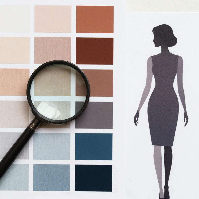 “A highly detailed, cinematic flat lay image focusing on a personal style analysis kit. Feature distinct swatches of warm (gold/earth tones) and cool (silver/blue tones) color palettes. Include a small, elegant magnifying glass resting on a swatch, a tailor’s measuring tape, and a subtle, abstract silhouette representing a person. Lighting should be soft, luxurious, and professional. High resolution, artistic composition.”