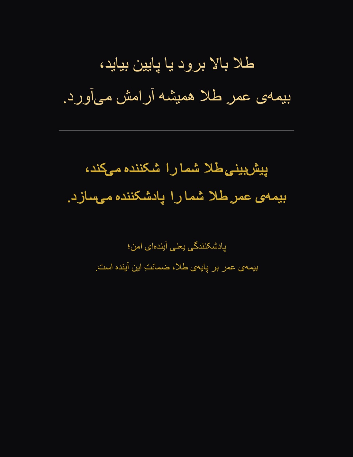 «پادشکنندگی یعنی ساختن ذهن و مسیری در زندگی که هر حادثه خوشایند یا ناخوشایند ما را قویتر کند، نه شکنندهتر. کسی که آینده را تنها بر اساس پیشبینی رشد یا سقوط طلا بنا میکند، با هر خطای پیشبینی فرو میریزد. اما اگر پشتوانهای داشته باشیم که در هر شرایطی تابآوری و اطمینان بیاورد، آنگاه بیرون از طوفانها خواهیم ایستاد. و اینجاست که بیمه عمر بر پایه طلا نه فقط یک انتخاب، بلکه ضمانتی برای آرامش و امنیت آینده است.»