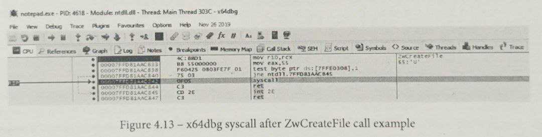 در نهایت، در اسکرینشات زیر میتوانید مشاهده کنید که پیش از اجرای دستور syscall، جریان اجرا از کتابخانه kernelbase.dll به کتابخانه ntdll.dll منتقل میشود و سپس از طریق این دستور به لایههای پایینتر سیستمعامل ویندوز، مانند هسته (Kernel)، انتقال مییابد.