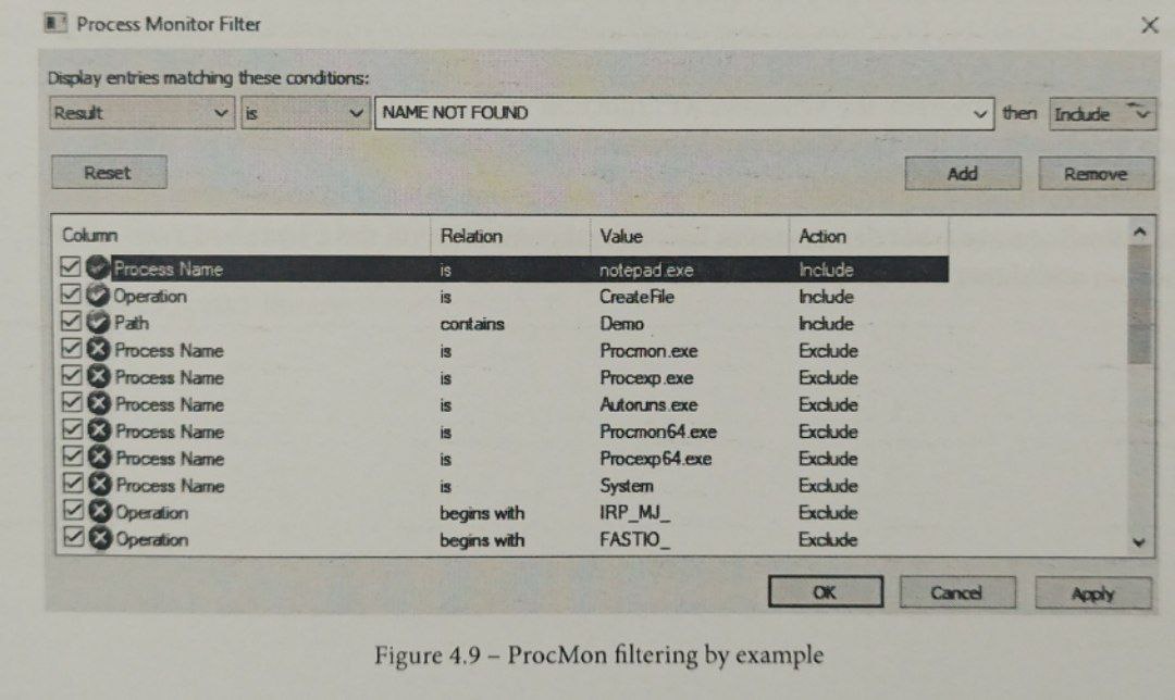 همانطور که در تصویر زیر نشان داده شده است، در Procmon.exe، فیلترها را تنظیم می کنیم: