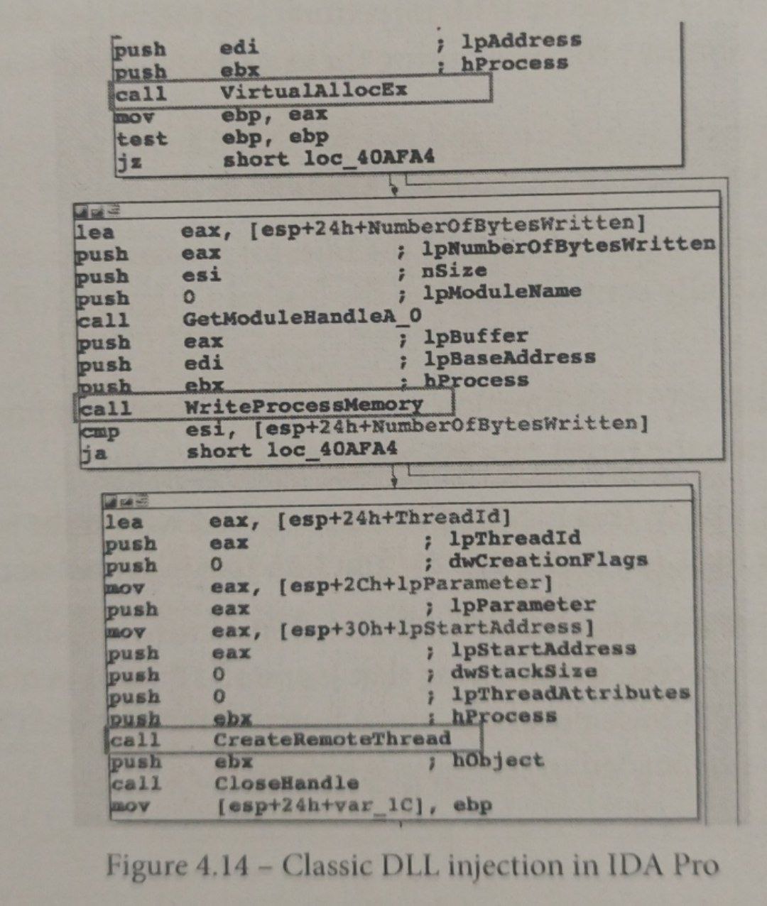 در تصویر اسکرینشات زیر، میتوانید یک بدافزار را مشاهده کنید که از تزریق DLL کلاسیک استفاده میکند؛ این تصویر در نمای IDA Pro نمایش داده شده است: