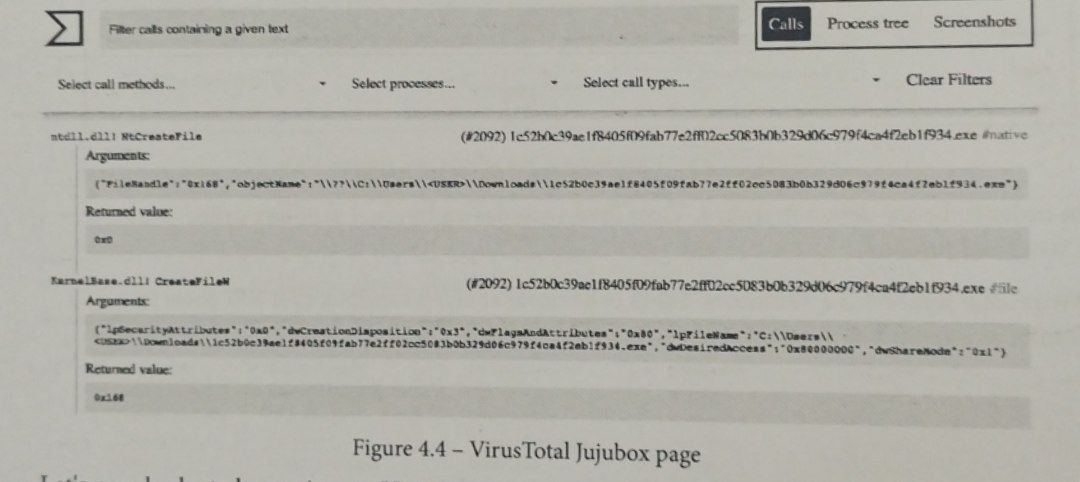 پس از آن، یک پنجره جدید باز میشود که شامل جزئیات استخراجشده از VirusTotal Jujubox خواهد بود؛ برای مثال فراخوانیهای API ویندوز (Windows API Calls)، درخت پردازشها (Process Tree)، اسکرینشاتها و موارد دیگر، همانطور که در اسکرینشات زیر نشان داده شده است: