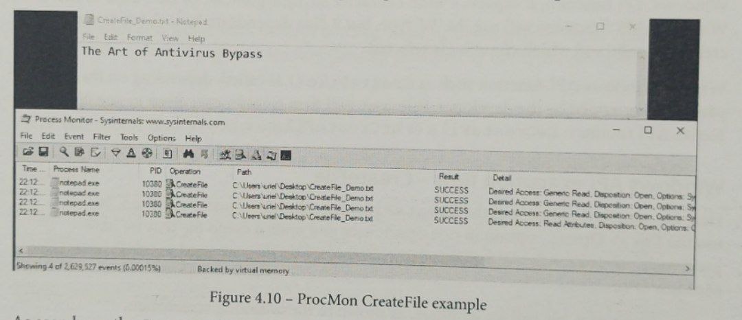 در اینجا یک مثال عملی از جریان اجرای CreateFile است که به آن اشاره شد. ما از گزینه File -> Open... در notepad.exe استفاده می کنیم و یک فایل آزمایشی را که قبلا برای این دمو ایجاد کرده ایم باز می کنیم. قبل از انجام این کار، باید از Process Monitor (ProcMon) استفاده کنیم.