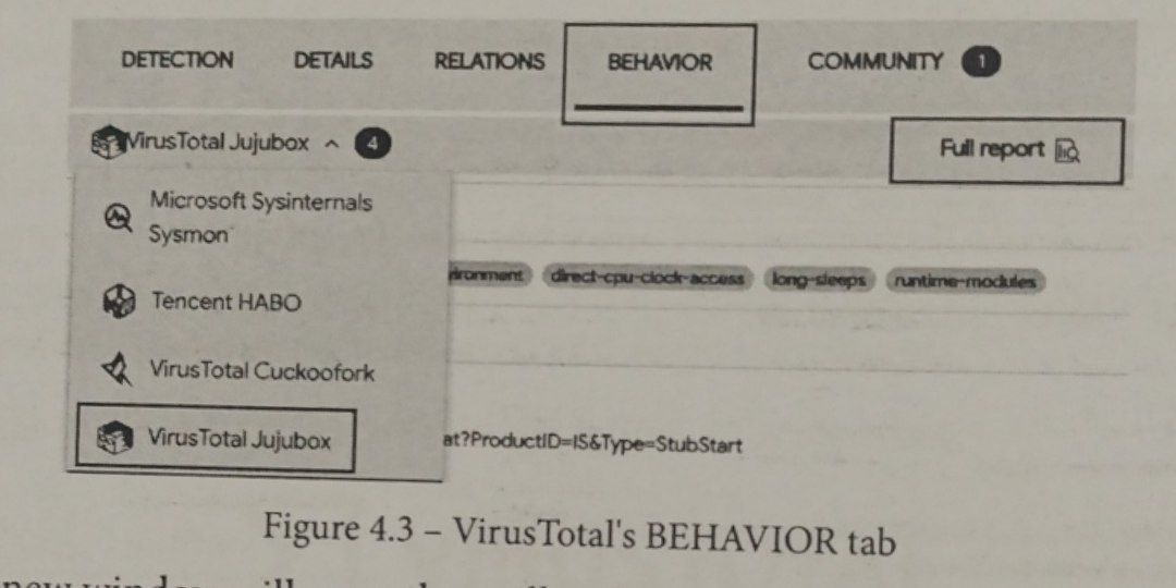 برای نمایش نتایج کامل سندباکس Jujubox، باید به تب BEHAVIOR بروید، روی VirusTotal Jujubox کلیک کنید و سپس بر روی گزارش کامل، همانطور که در تصویر زیر نشان داده شده است، کلیک کنید: