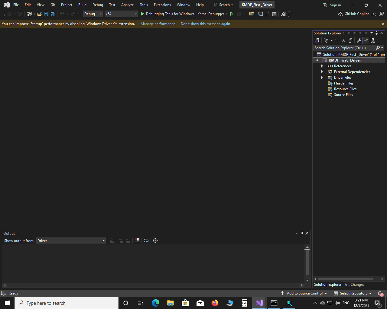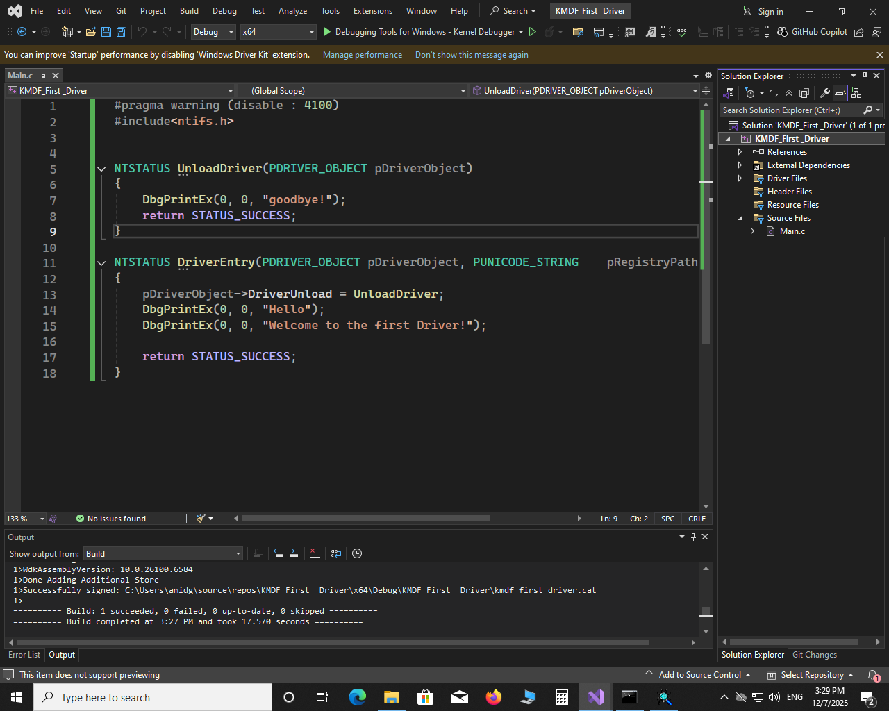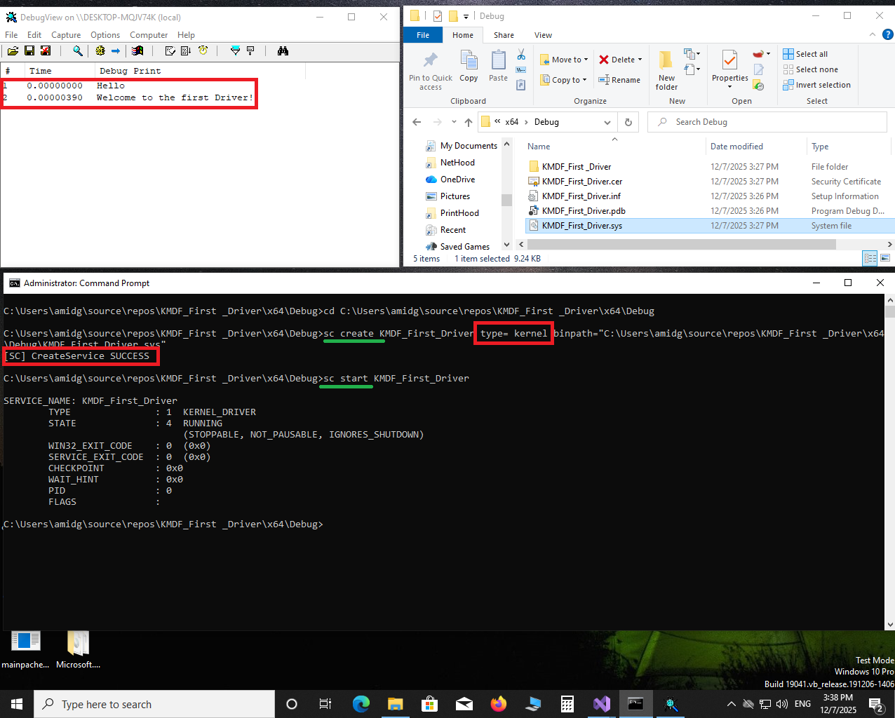 #pragma warning (disable : 4100) #include<ntifs.h> NTSTATUS UnloadDriver(PDRIVER_OBJECT pDriverObject) { DbgPrintEx(0, 0, "goodbye!"); return STATUS_SUCCESS; } NTSTATUS DriverEntry(PDRIVER_OBJECT pDriverObject, PUNICODE_STRING pRegistryPath) { pDriverObject->DriverUnload = UnloadDriver; DbgPrintEx(0, 0, "Hello"); DbgPrintEx(0, 0, "Welcome to the first Driver!"); return STATUS_SUCCESS; }