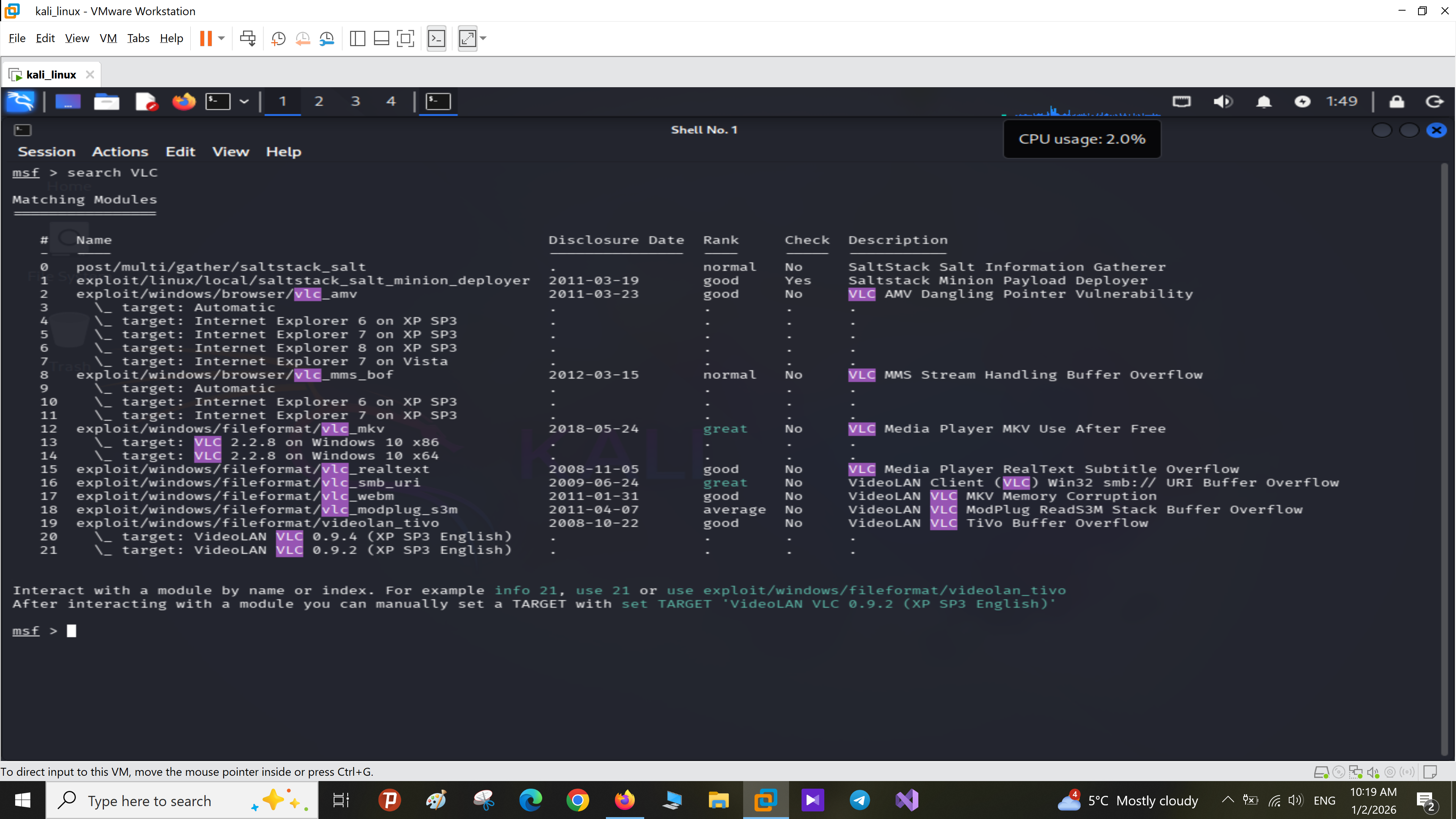 برای مثال، اگر بخواهیم بررسی کنیم چه اکسپلویتهایی برای VLC وجود دارد، میتوانیم از دستور search استفاده کنیم.