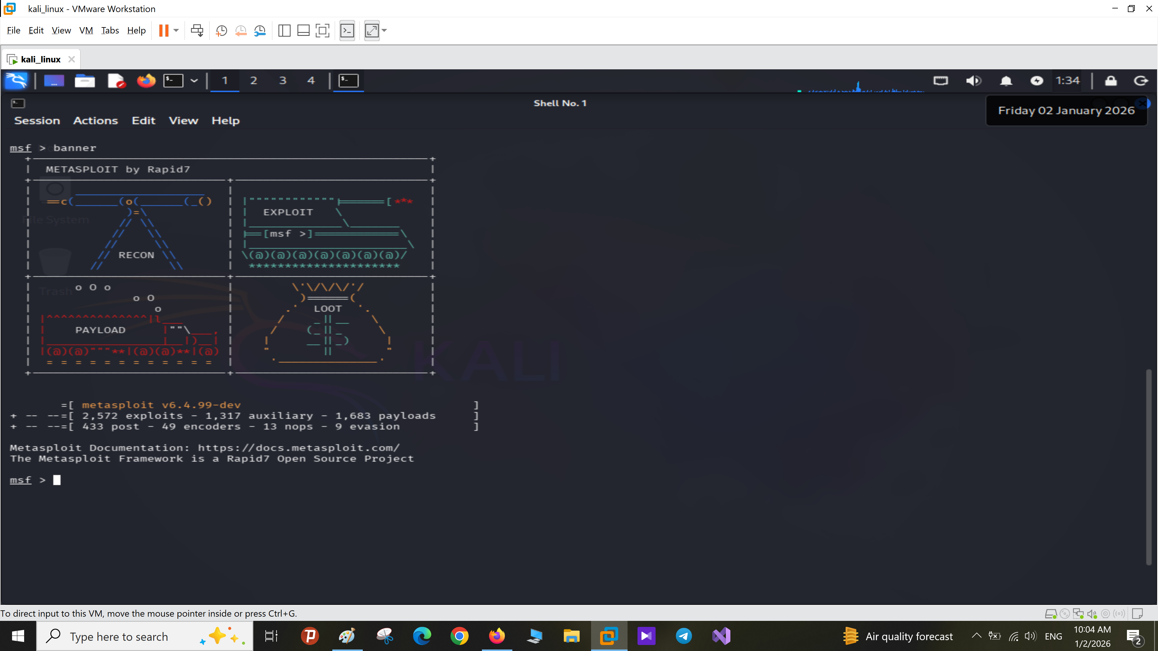 دستور banner یک دستور بسیار ساده است که برای نمایش اطلاعات بنر فریمورک Metasploit استفاده میشود. این اطلاعات معمولاً شامل جزئیات نسخه و تعداد اکسپلویتها، ماژولهای کمکی (auxiliaries)، پیلودها، انکودرها و مولدهای NOP موجود در نسخه نصبشده فعلی است.