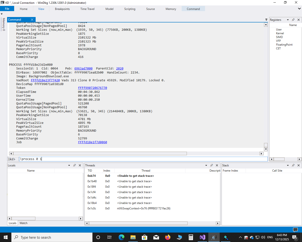 معمولاً ابتدا دستور !process 0 1 را اجرا میکنیم تا لیست پروسسها همراه با Threadهای آنها نمایش داده شود. سپس با استفاده از دستور !thread <ThreadAddress> میتوانیم جزئیات کامل هر Thread را بررسی کنیم.