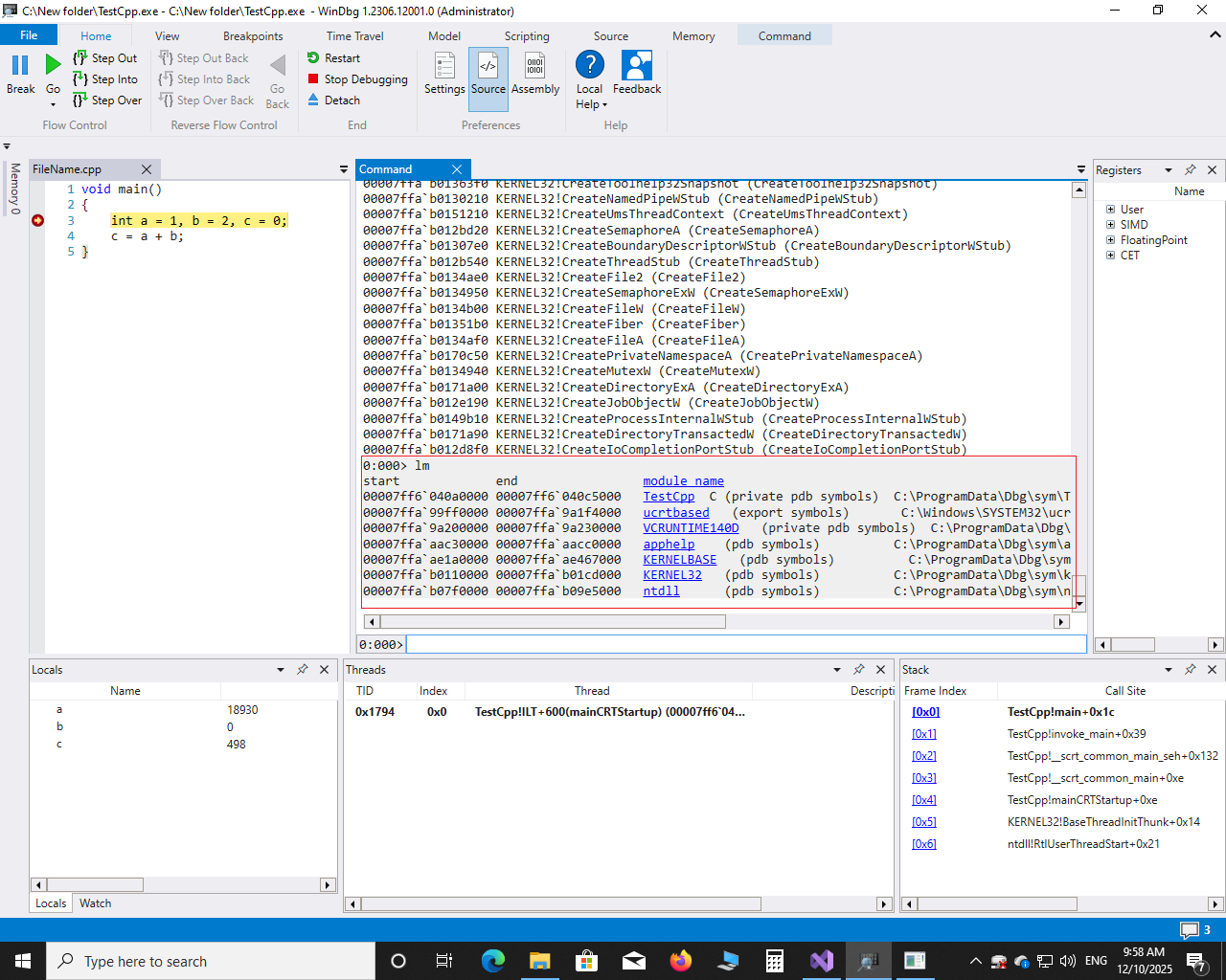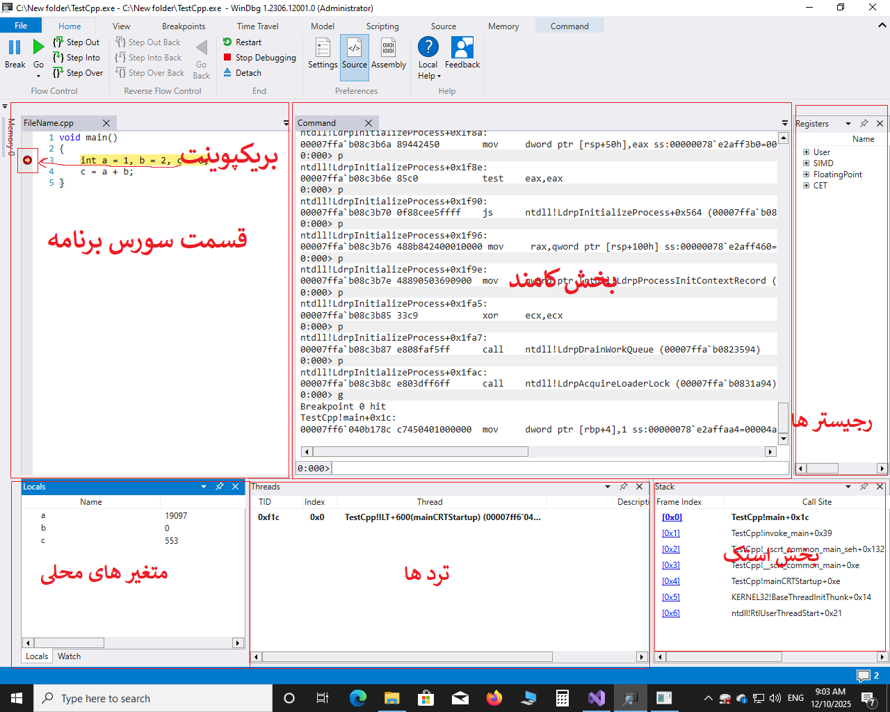 برای باز کردن یک exe ابتدا فایل pdb را کنار exe میگذاریم و سپس مطابق شکل زیر فایل رو در WinDbg Preview باز میکنیم: