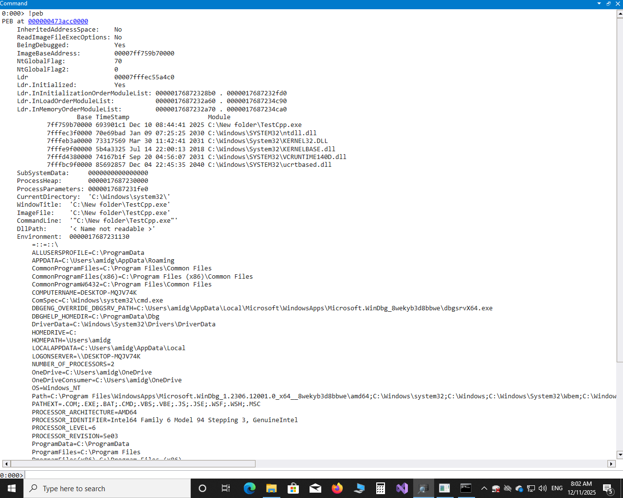 دستور !peb در WinDbg / WinDbg Preview برای نمایش ساختار PEB (Process Environment Block) استفاده میشود.