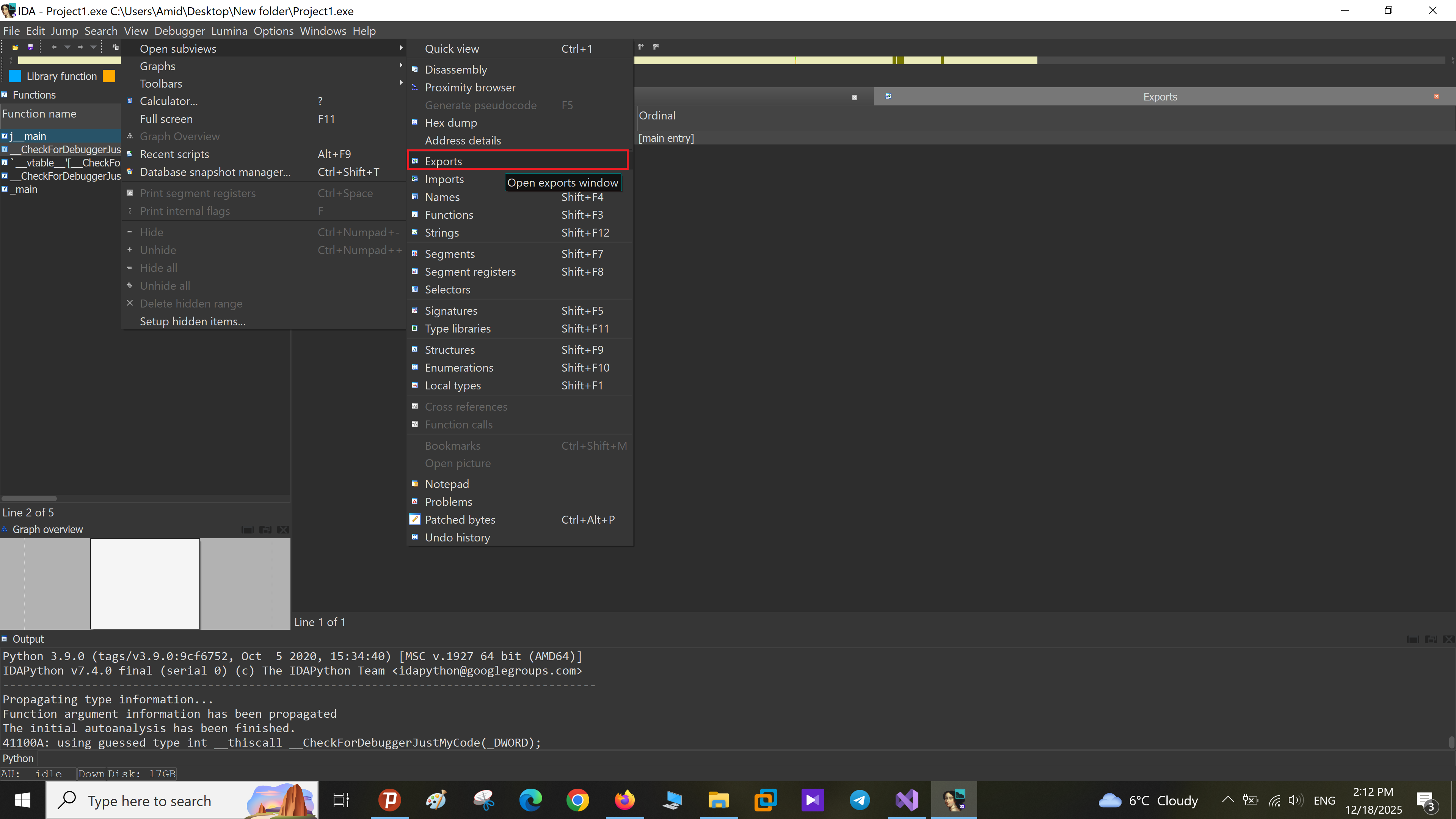 از همین لیست میتوانید روی هر مورد دابلکلیک کنید تا مستقیماً به آدرس آن در disassembly بروید و تحلیل روی نقطهی ورودها یا APIهایی که باینری به بیرون ارائه میدهد را راحتتر انجام دهید.