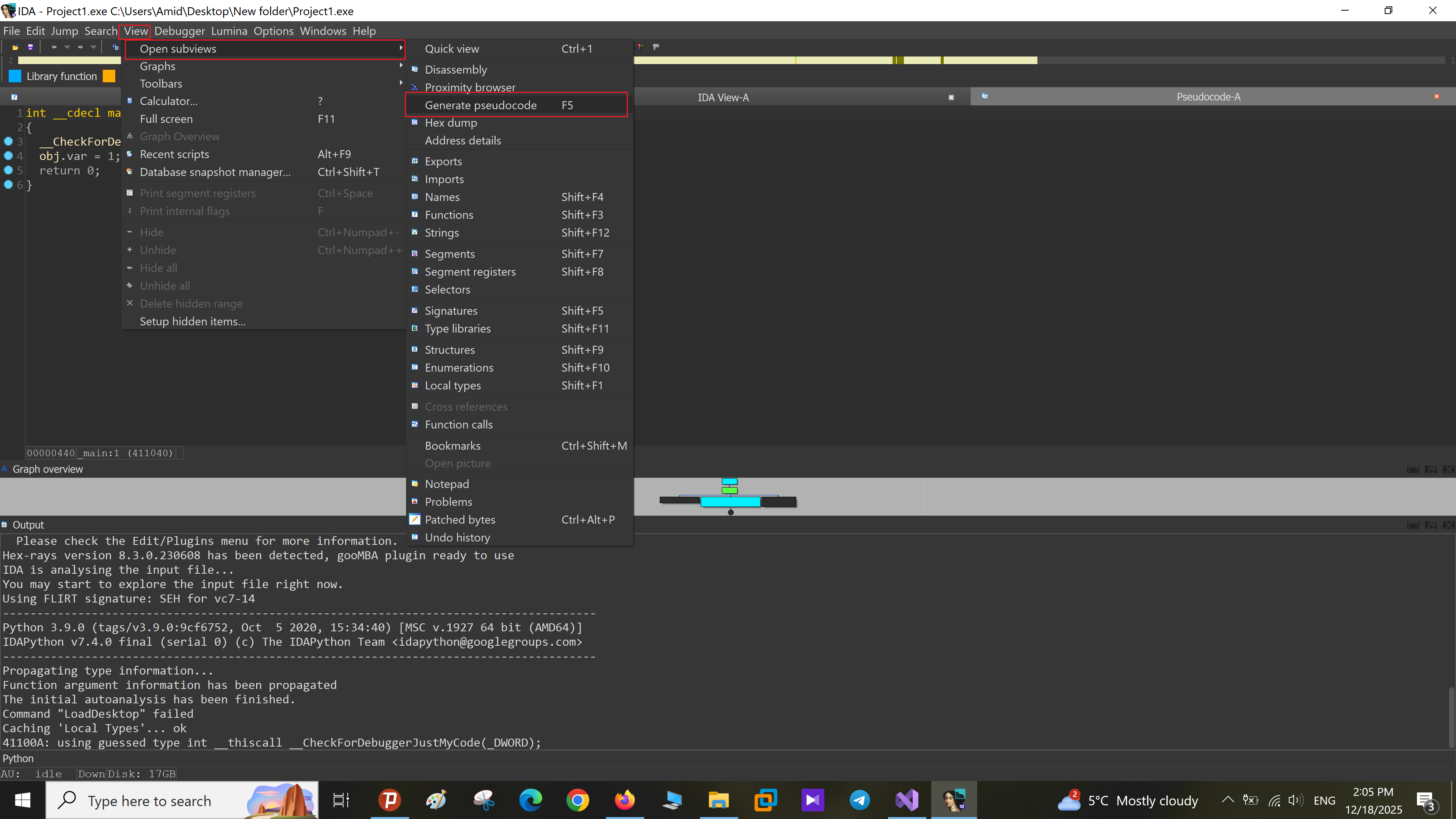 گزینه Generate pseudocode (کلید F5) است و برای تولید شبهکد C‑مانند از اسمبلیِ تابع فعلی استفاده میشود.