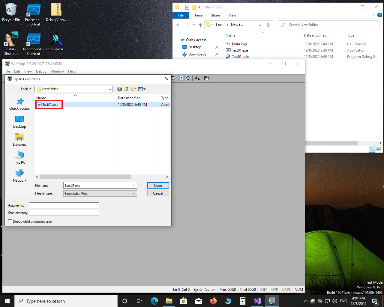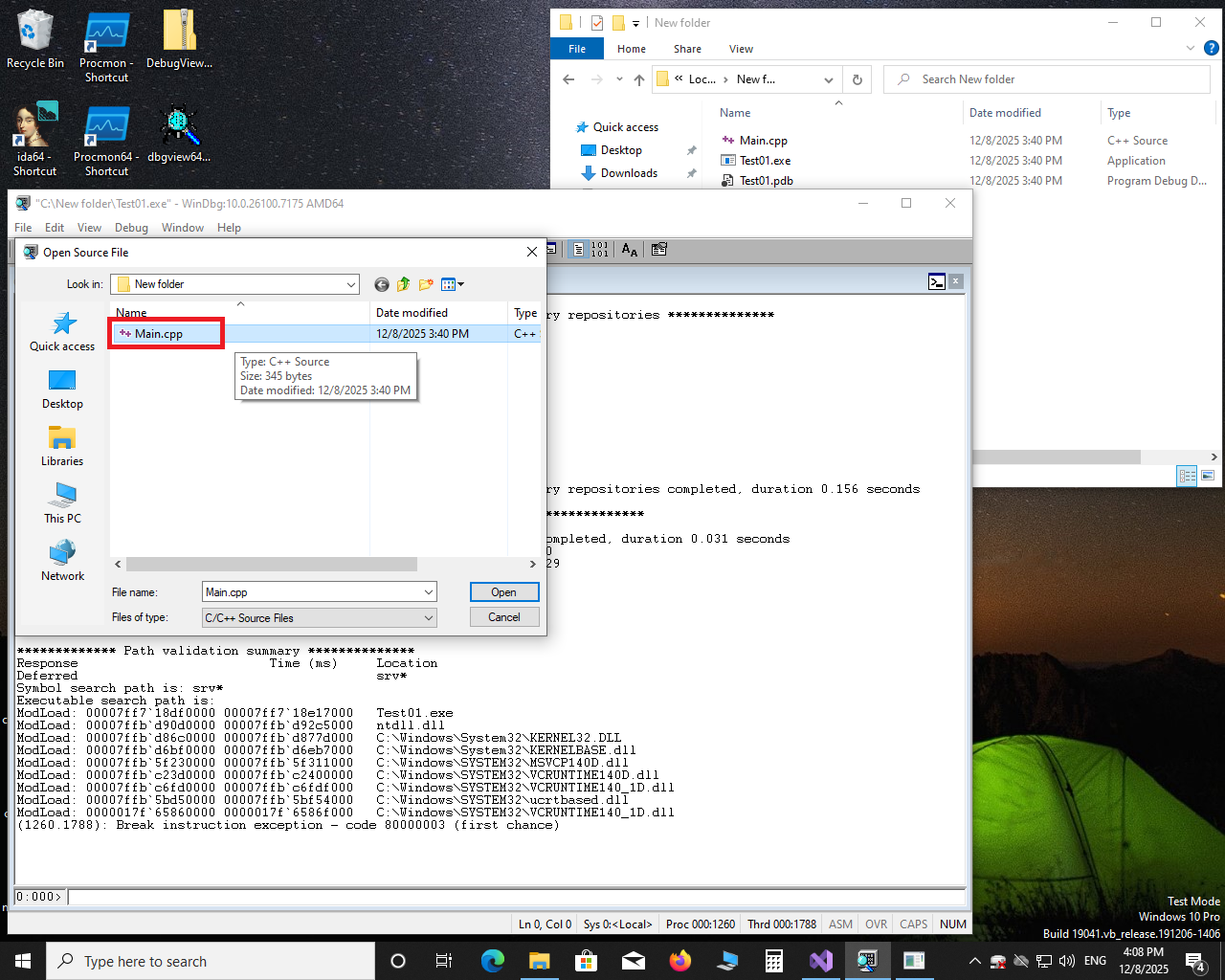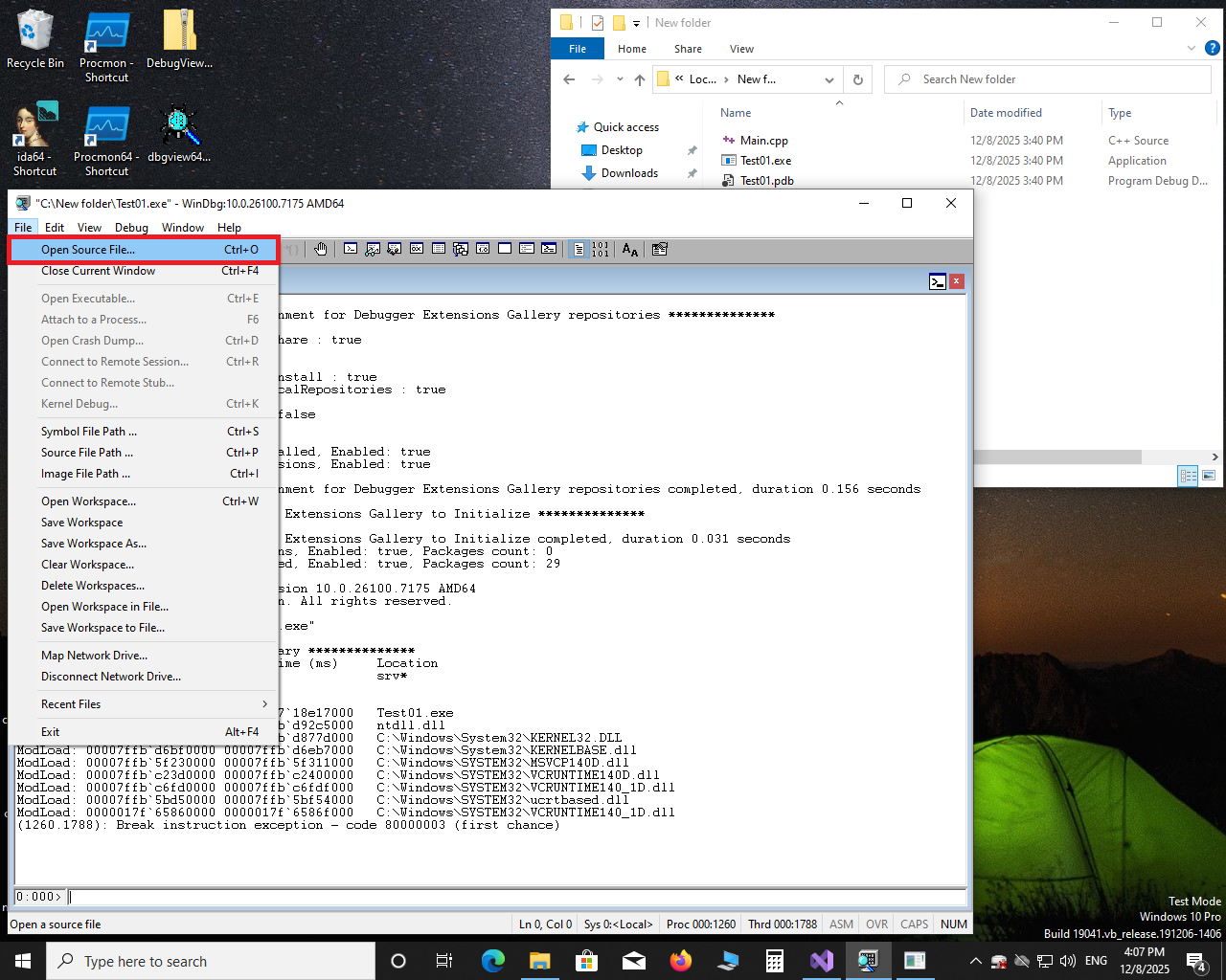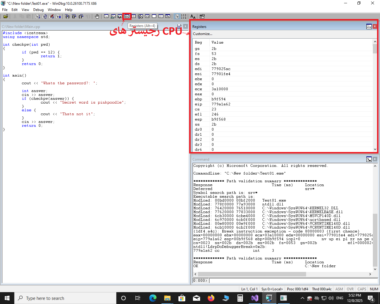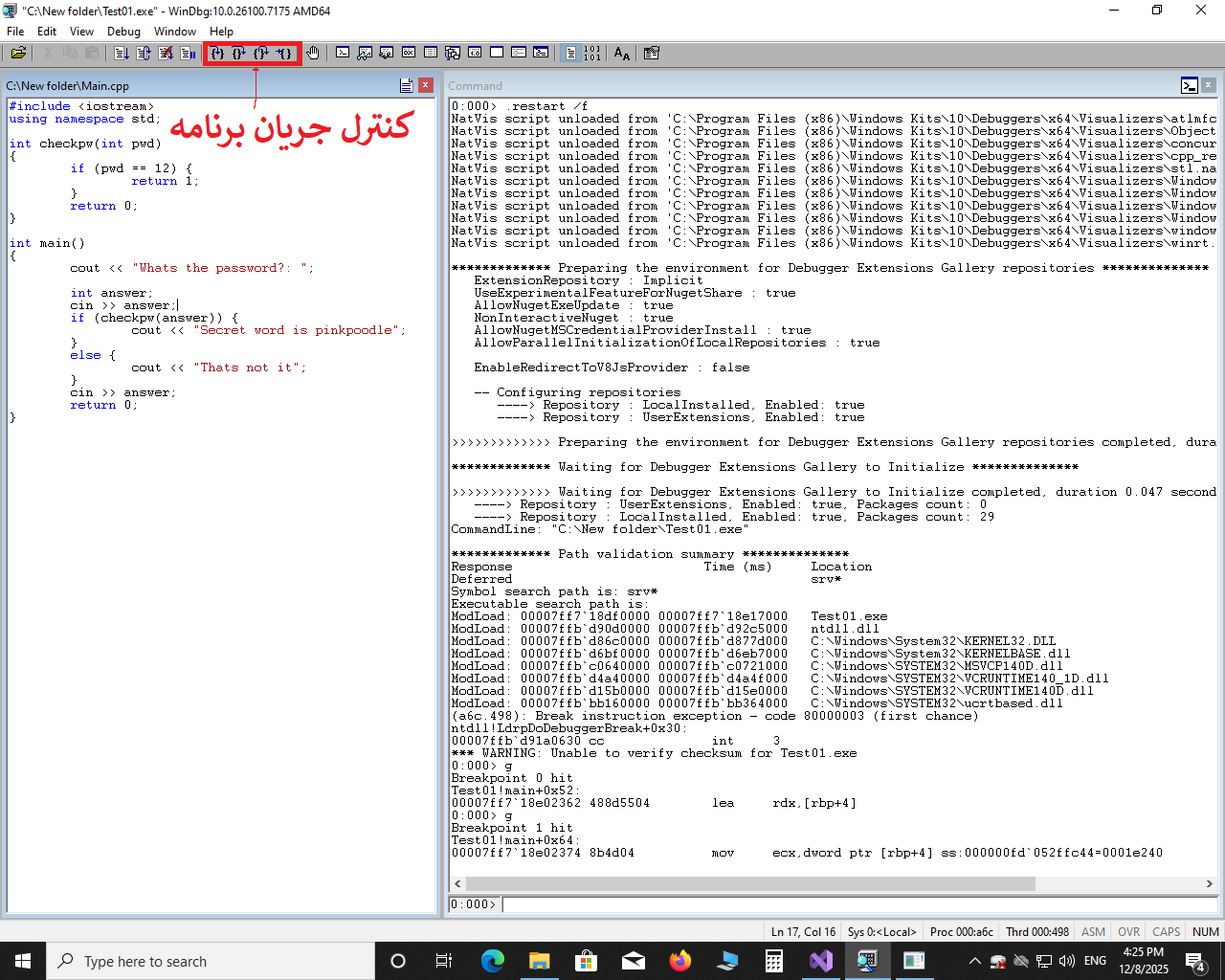اگر به درستی مراحل طی شده باشد windbg به صورت زیر میشود: