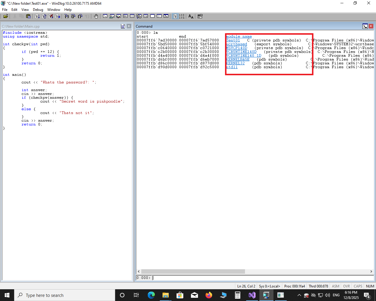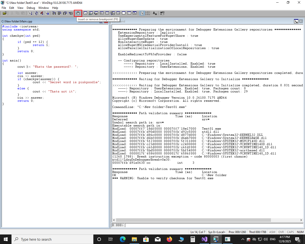 #include <iostream> using namespace std; int checkpw(int pwd) { if (pwd == 12) { return 1; } return 0; } int main() { cout << "Whats the password?: "; int answer; cin >> answer; if (checkpw(answer)) { cout << "Secret word is pinkpoodle"; } else { cout << "Thats not it"; } cin >> answer; return 0; }
