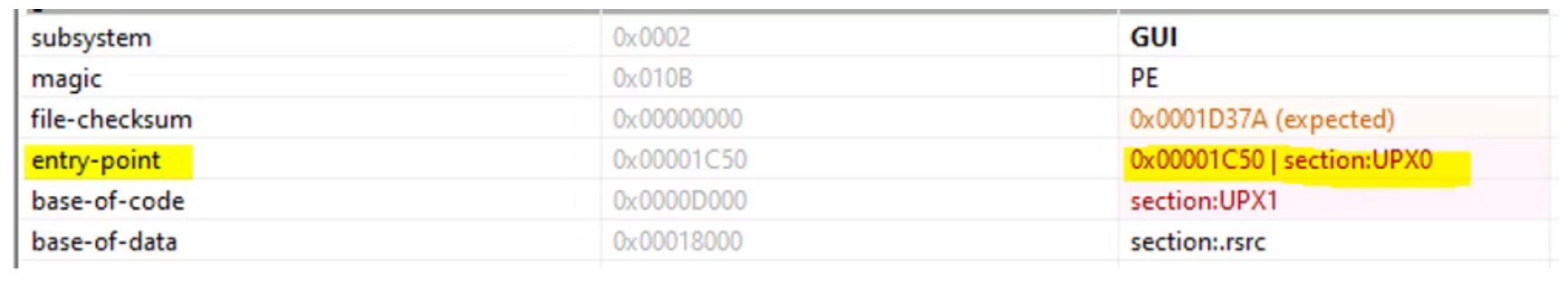 معمولاً نقطهٔ ورود یک فایل دودویی، به بخش text اشاره دارد که کد برنامه در آن ذخیره شده است. اما در این نمونه، نقطهٔ ورود به Unpacking Stub اشاره میکند که ابتدا فایل را از حالت فشرده خارج میکند و سپس کد آنپکشده را اجرا میکند.