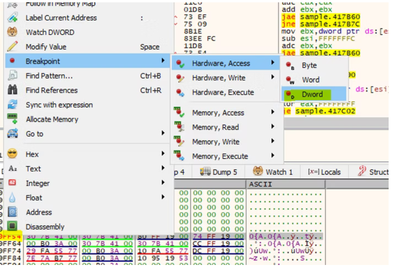در پنجرهٔ Dump، روی آدرسی که در رجیستر ESP بود (0019FF54) راستکلیک کردم و یک Breakpoint سختافزاری (Hardware Breakpoint) برای زمانی که DWORD دسترسی پیدا میکند، تنظیم کردم.