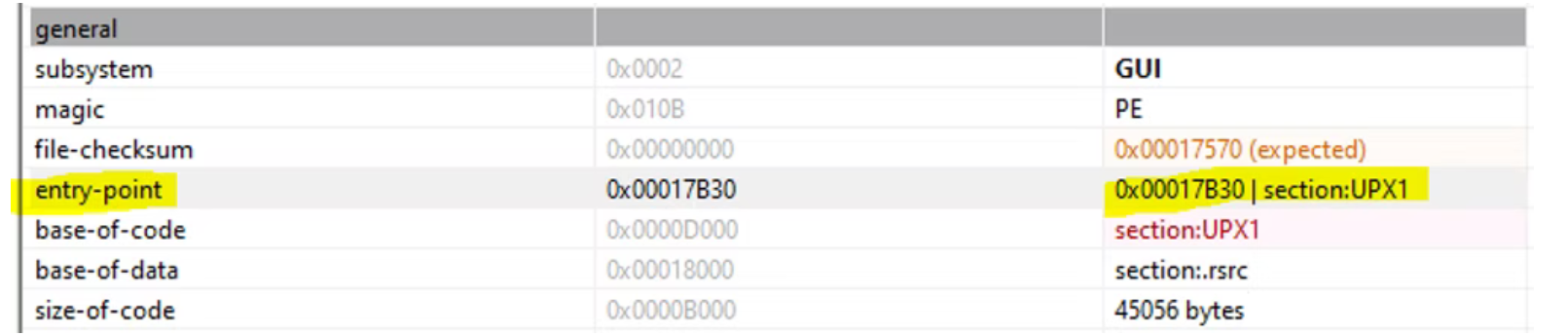 با نگاه کردن به نقطهٔ ورود (Entry Point) نمونه، میتوان دید که این نقطه به بخش (Section) با نام UPX1 در آدرس 0x00017B30 اشاره میکند.