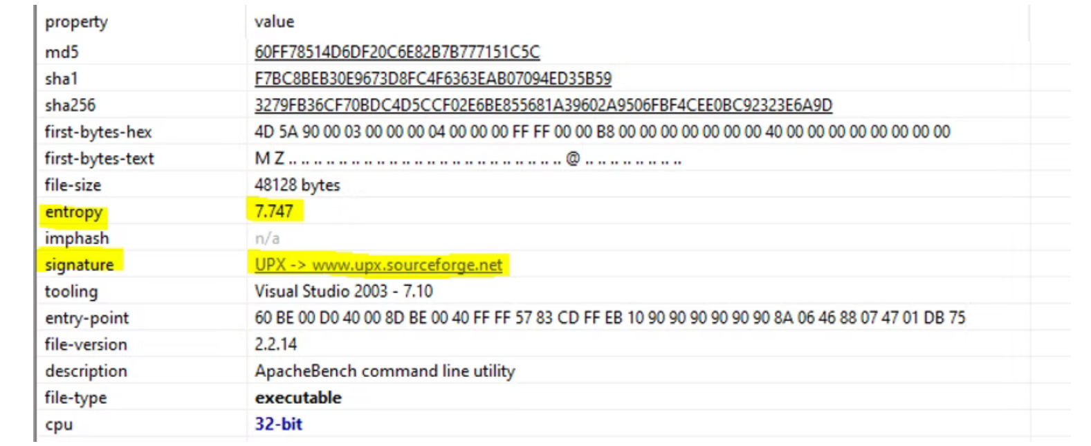 نشانهٔ دیگری که به راحتی قابل تشخیص است، امضای فایل است. به عنوان مثال، اگر فایل دارای امضای UPX باشد، این میتواند نشان دهد که فایل با UPX پک شده است.