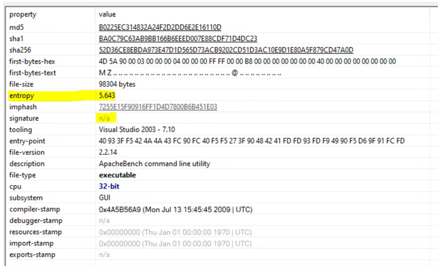 اولین نشانه، وجود آنتروپی کلی بالا در فایل است. آنتروپی معیاری برای سنجش تصادفی بودن دادهها است و هرچه آنتروپی بالاتر باشد، دادهها تصادفیتر بوده و معمولاً به این معناست که کدگذاری یا رمزگذاری شدهاند.