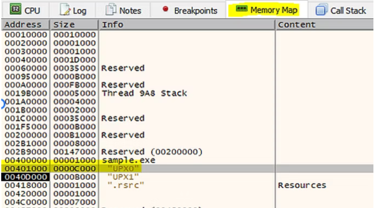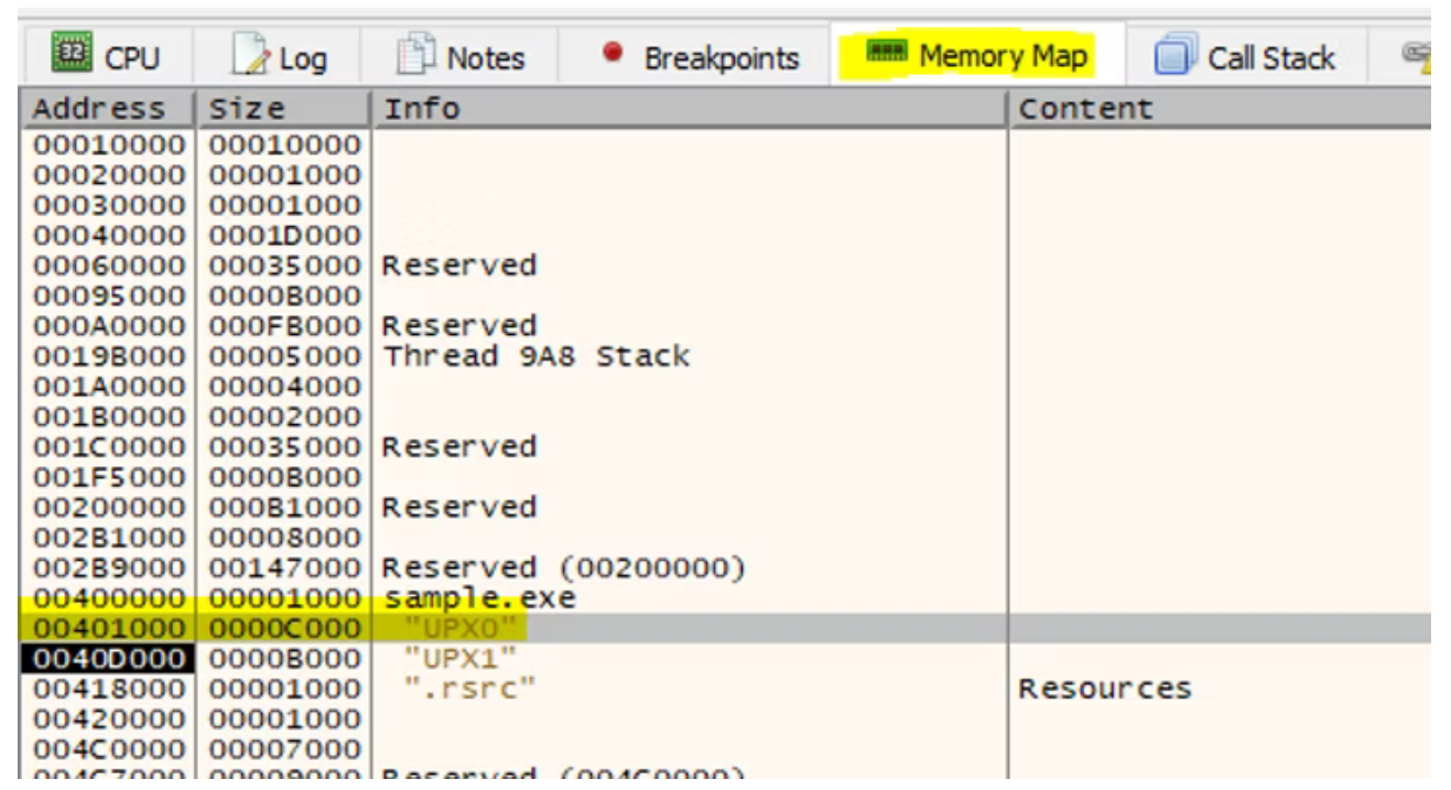 ابتدا لازم بود آدرس حافظهٔ سکشن UPX0 را پیدا کنم؛ این همان بخشی است که استابِ بازگشایی (unpacking stub) کد را در آن آنپک میکند.