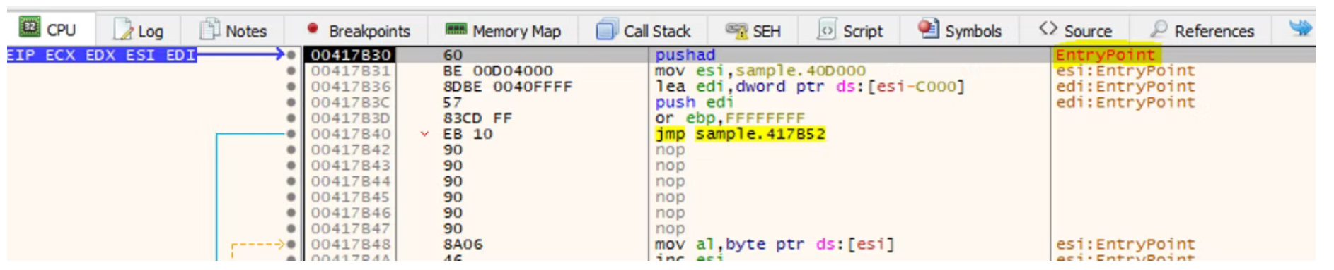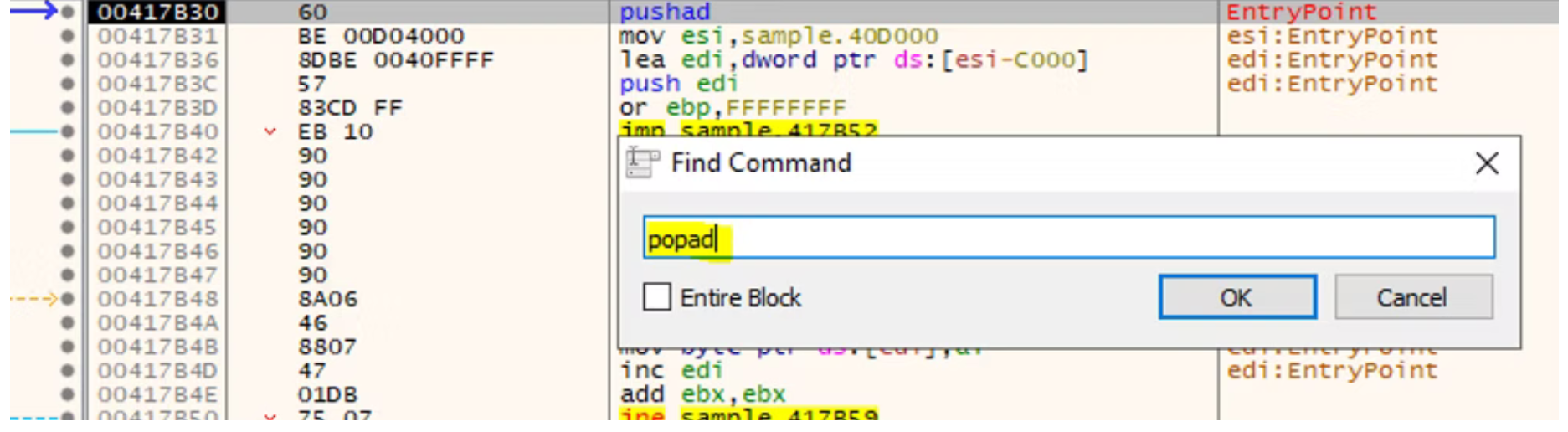 گام بعدی این است که دستور pushad را پیدا کنیم. این دستور در واقع OEP (Original Entry Point) باینری است و برای ریختن همهٔ رجیسترهای ۳۲ بیتی روی استک استفاده میشود.