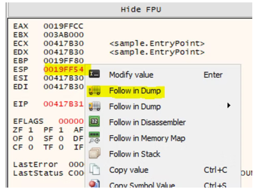 بعد از اجرای این دستور، به پنجرهٔ رجیسترها (Registers Window) رفتم و روی مقدار رجیستر ESP (که برابر 0019FF54 بود) راستکلیک کردم و آن را در Dump دنبال کردم. این مقدار Stack Pointer است و به آیتم بعدی روی استک اشاره میکند.
