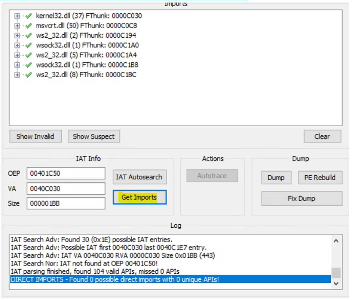 پس از اینکه جدول IAT پیدا شد، من روی Get Imports کلیک کردم تا ایمپورتهایی که در باینری استفاده شدهاند را شناسایی کنم.