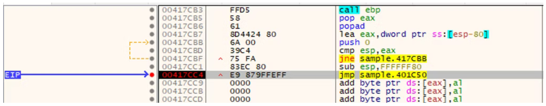 اجرای برنامه تا زمانی که به OEP برسیم؛ در این مرحله برنامه خودش را در حافظه آنپک کرده و اجرای آن در OEP متوقف میشود. اینجا دقیقاً قبل از اجرای کد آنپکشده قرار میگیریم.