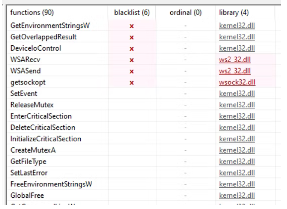 در تصویر زیر میتوانیم لیستی از کتابخانههایی که ایمپورت شدهاند را ببینیم و درون آنها، توابع ایمپورتشده قرار دارند.