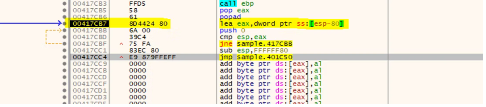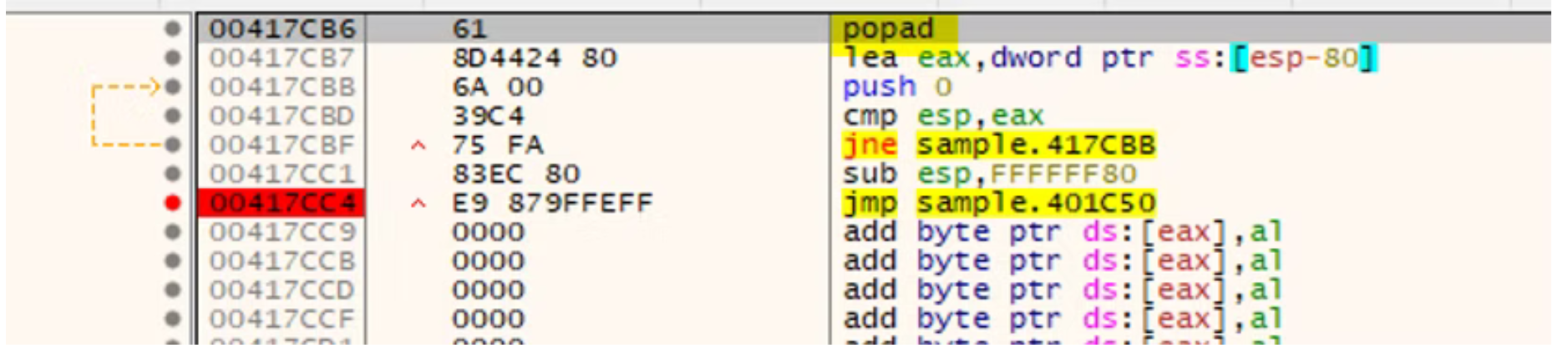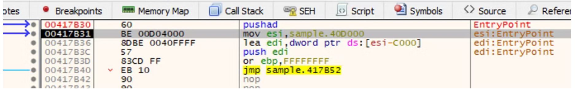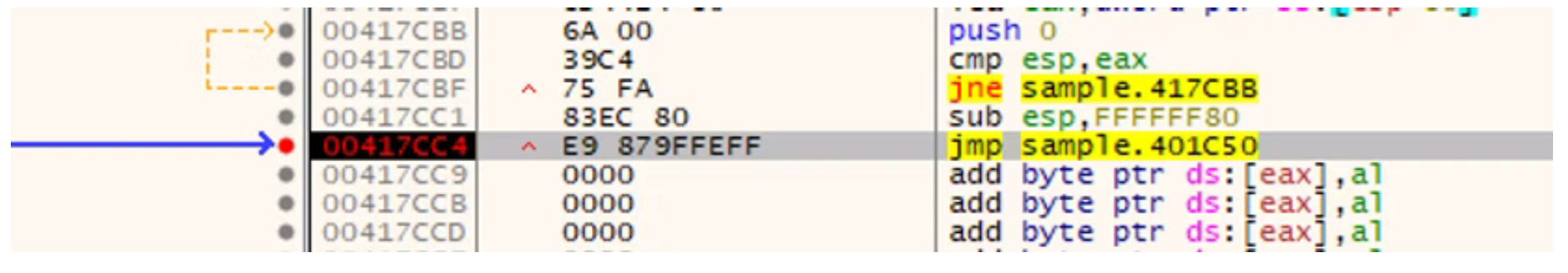 این بدان معناست که این دستور Jump ما را به کد آنپکشده خواهد برد. در این نقطه، من یک Breakpoint روی این دستور قرار دادم.