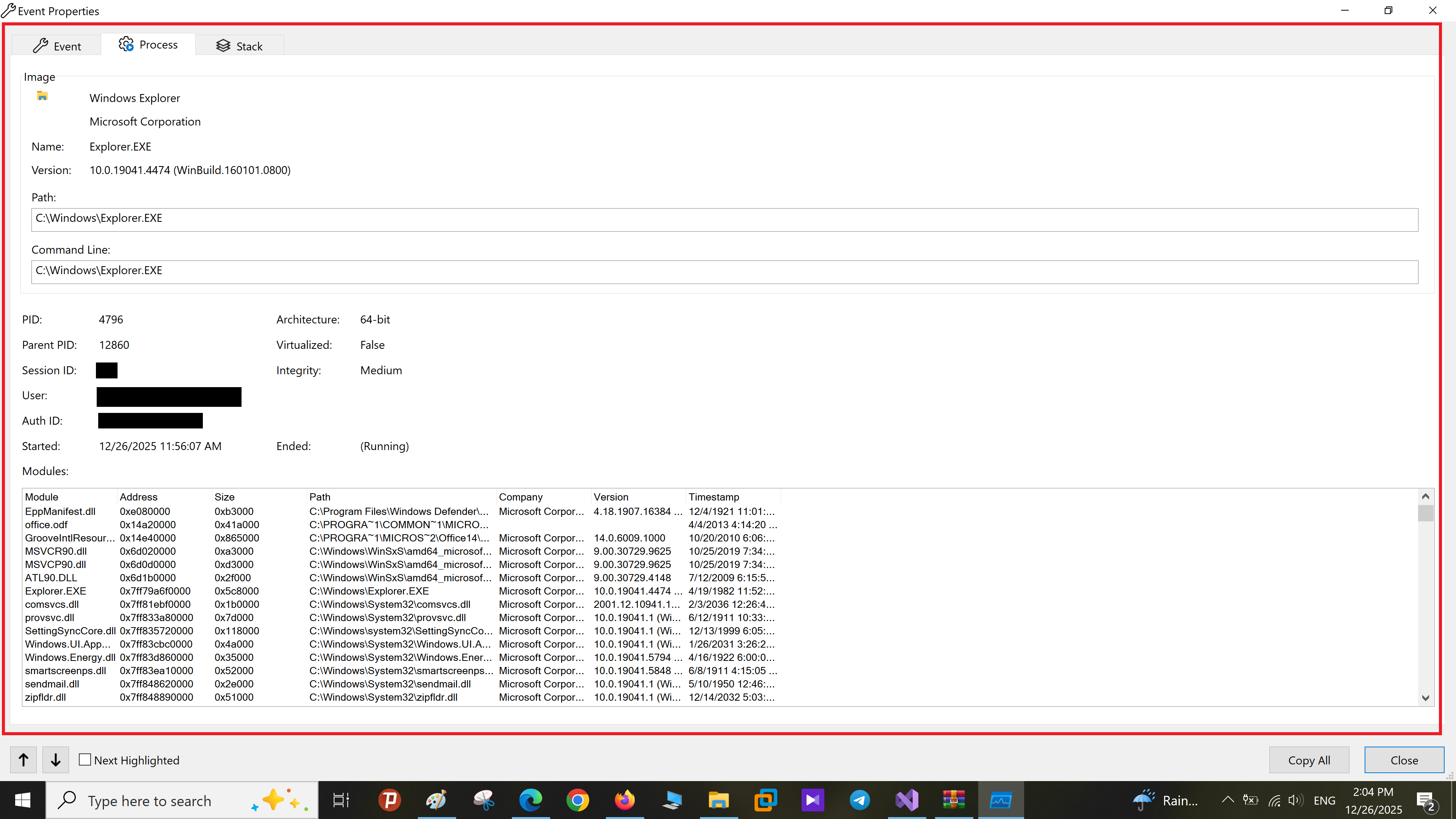 Session ID شماره نشست کاربری است که فرایند در آن اجرا میشود، User نام کاربریای است که فرایند تحت آن حساب اجرا شده و Auth ID شناسه تأیید هویت آن نشست است. این بخش کمک میکند بدانیم فرایند متعلق به کدام کاربر است و در چه محیطی اجرا شده است.