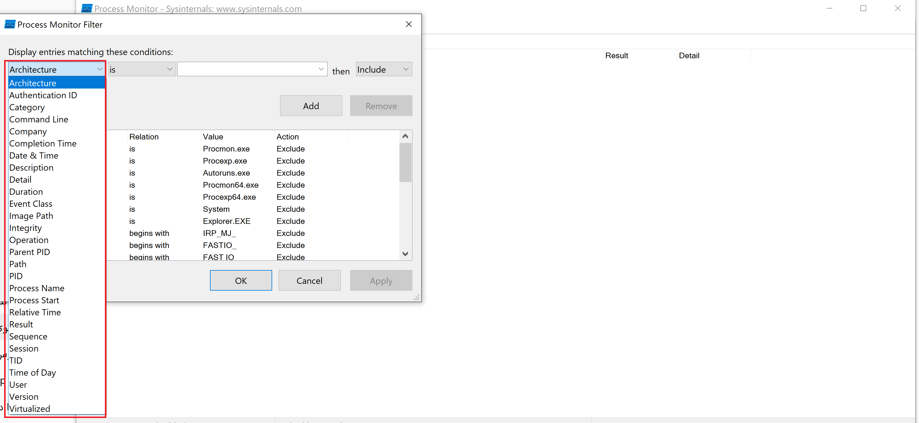 لیست فیلدهای قابل فیلتر در ابزار Process Monitor (Procmon) است. این فیلدها مشخص میکنند که شما «بر اساس چه ویژگیای» رویدادها (Eventها) را فیلتر کنید. در واقع هر کدام یک ستون یا خصوصیت از رویدادهای سیستم هستند که میتوانند مبنای Include یا Exclude شدن قرار بگیرند.