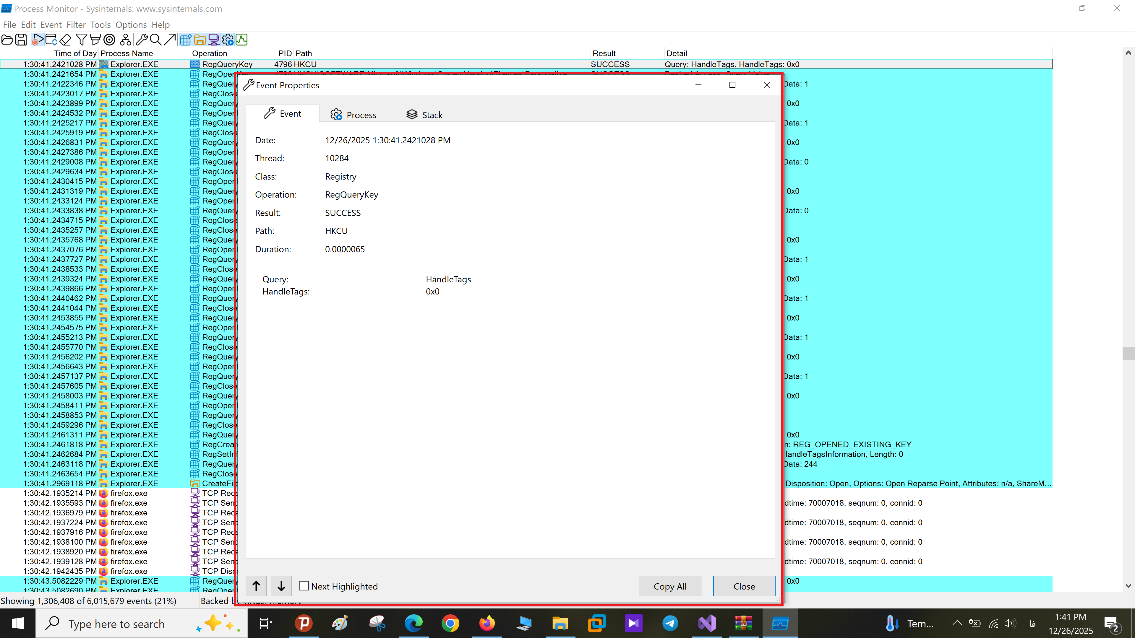 Duration مدت زمانی است که از آغاز تا پایان اجرای عملیات صرف شده است. مقدار 0.0000065 ثانیه (چند میکروثانیه) نشان میدهد این پرسوجوی رجیستری بسیار سریع انجام شده است. بررسی Duration در تعداد زیاد رویداد میتواند برای شناسایی گلوگاههای کارایی در سیستم مفید باشد.