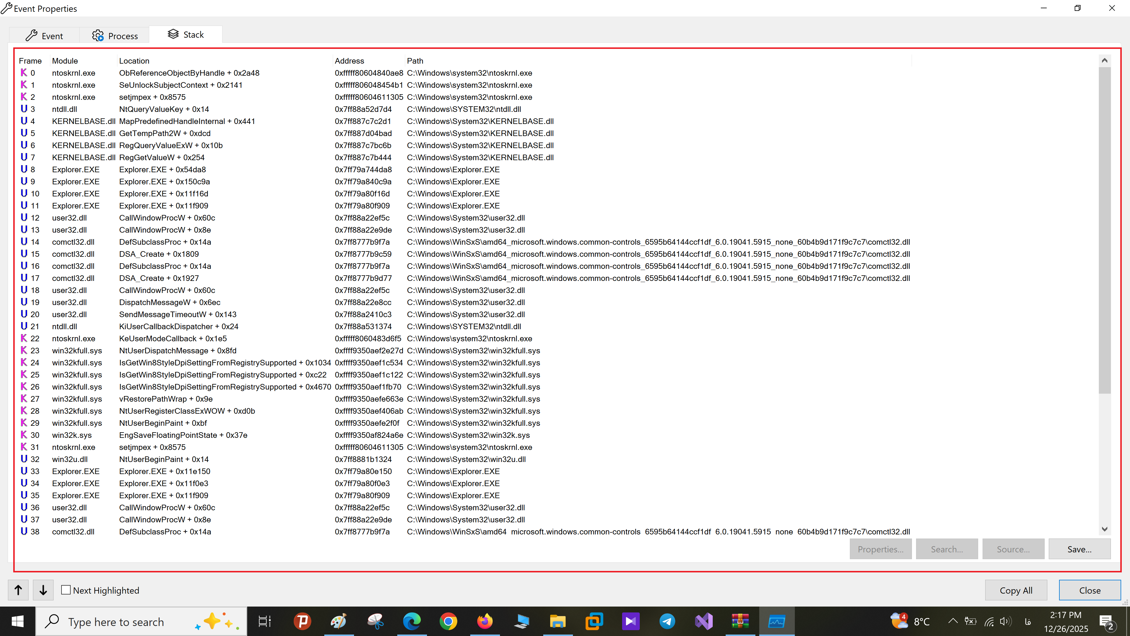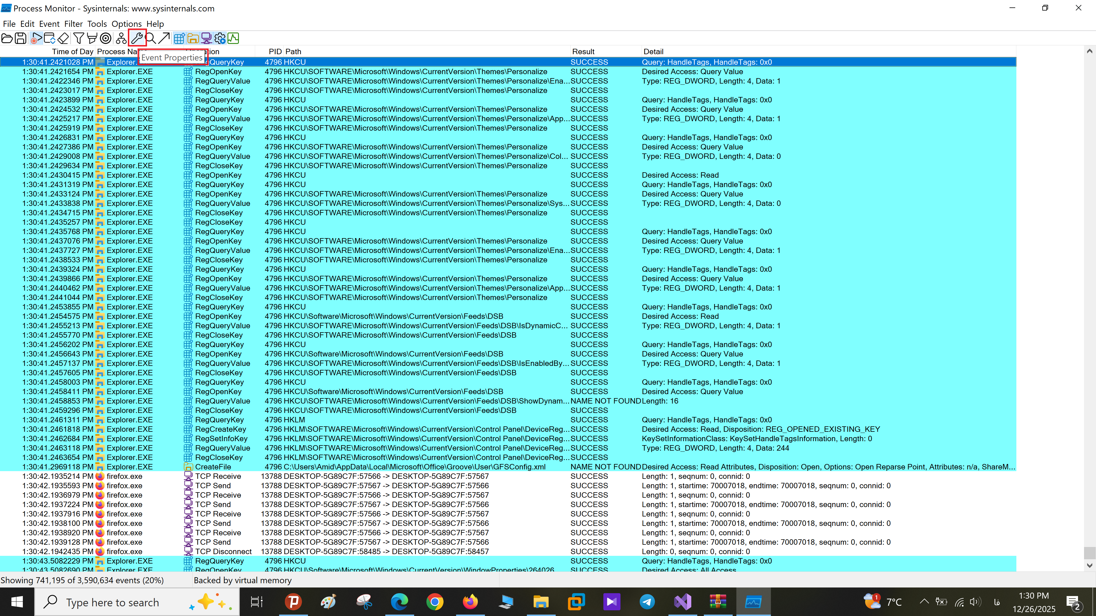 قسمت Event Properties که در بالای تصویر دیده میشود، جزئیات دقیقتری را در مورد هر رویداد (Event) که در Process Monitor ثبت میشود، نشان میدهد. این قسمت به شما اطلاعات کاملی از فعالیتهای سیستم و فرآیندها در زمان واقعی میدهد.